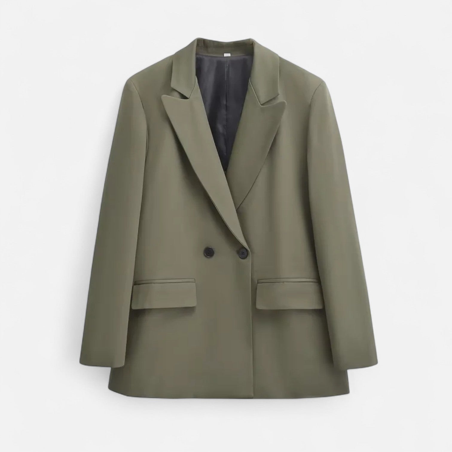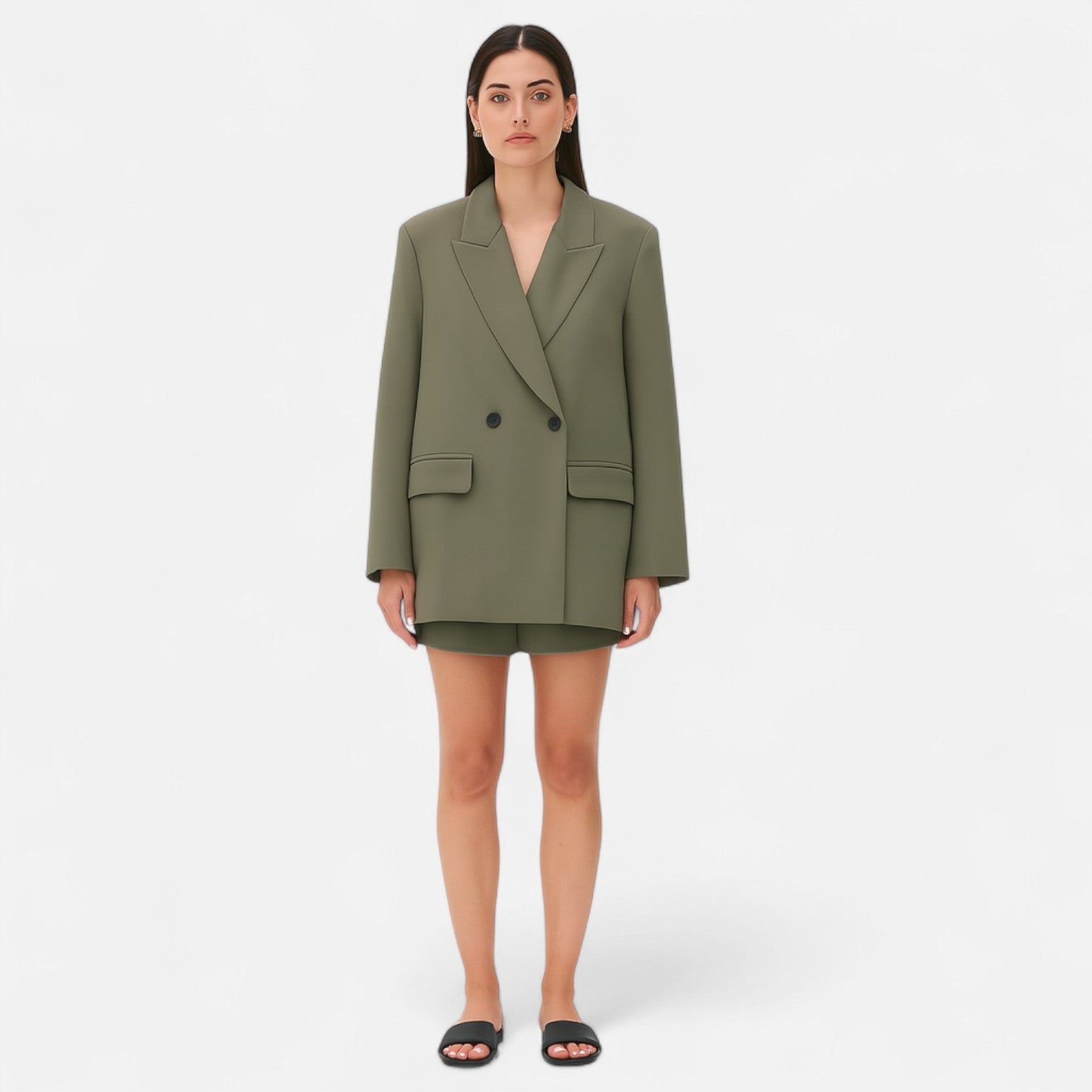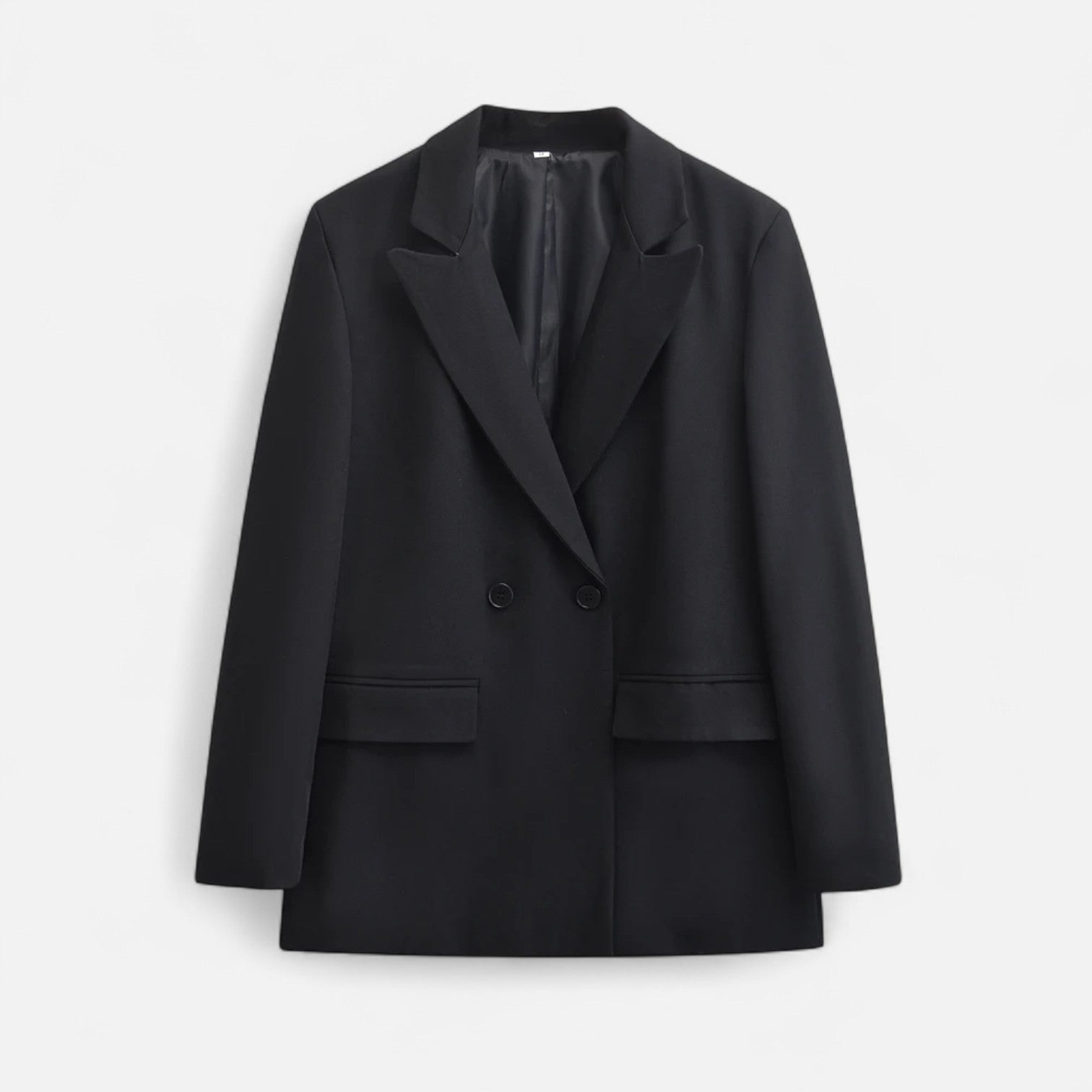 This refined double-breasted blazer features a classic crossover closure with elegant buttons for a chic, confident touch. The structured long sleeves and defined shoulders ensure a sharp, professional look, while the option of a fitted or straight cut adapts to every body type, subtly highlighting the waist or embracing a more androgynous style.